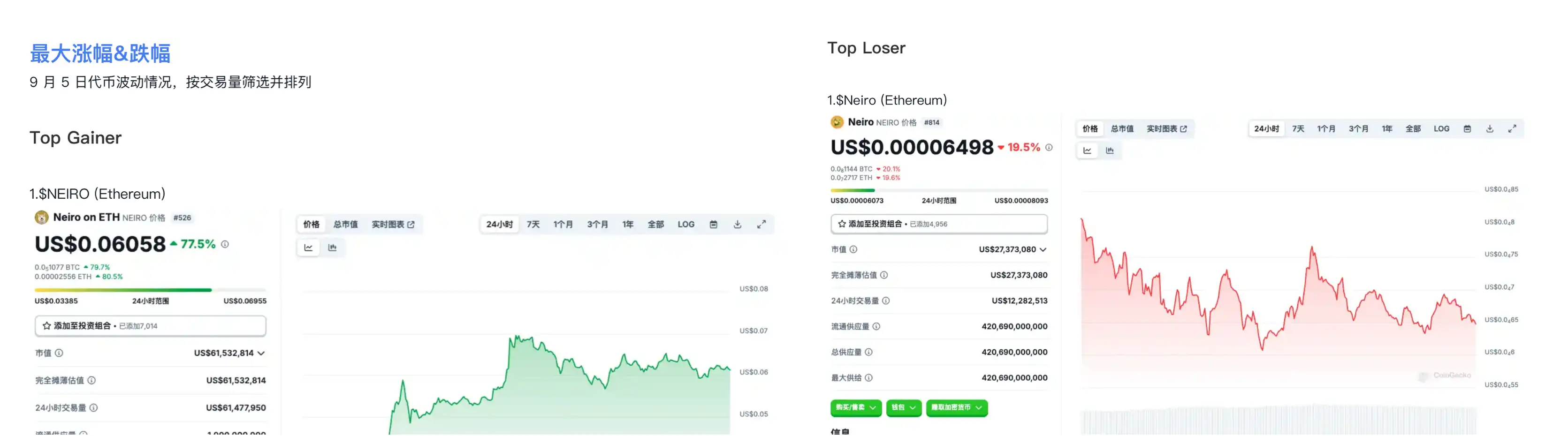 更有意思的是,最近几天阅读晚报的读者应该会发现,在 neiro 合约上线这则消息正式公布的前两天,neiro 和 neiro 就不断出现在当日代币涨跌榜中,前者一直涨,后者一直跌。现在看上去,许多人像是早已拿到消息提前布局了。